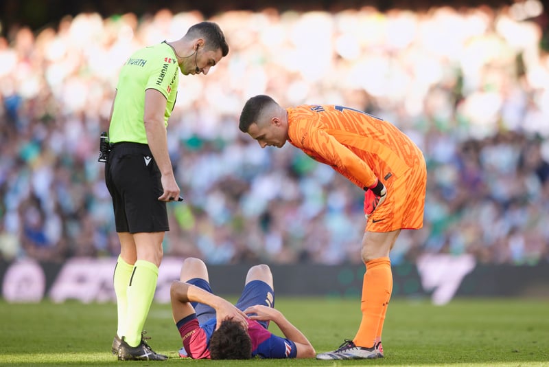Sí fue más generalizado, en el minuto 57 de partido, el cántico de '¡Árbitro, cabrón!', iniciado por el mismo personaje en Gol Sur con el micro, secundado por esa zona del estadio y coreado por otros sectores en protesta a una decisión de Alejandro Muñiz Ruiz , que indultó a Marc Casadó por una dura entrada sobre Ez Abde, acción ésta previa a la señalización, previa consulta con su compañero desde la sala VOR Valentín Pizarro Gómez del penalti por pisotón por detrás de Frenkie de Jong a Vitor Roque que, sospechosamente, se le había pasado en directo al colegiado principal, que pidió ver varias repeticiones y tomas antes de castigar el mediocentro neerlandés, pues creía que se refería su compañero a un empujón igualmente evidente pero, para él, sin la suficiente fuerza como para derribar al delantero brasileño en su carrera en dirección a Iñaki Peña.