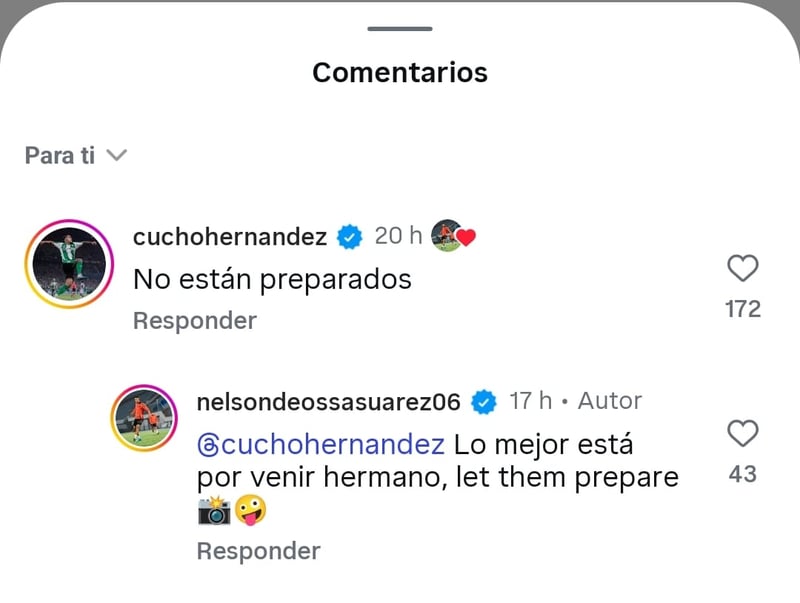 Antes de esta cita tan marcada para él en tierras belgas, Nelson Deossa se ha puesto en manos divinas. Ha usado un salmo para buscar protección religiosa "ante todo mal" que pueda acontecer en este camino que le toca emprender y que casi considera el inicio de su etapa en el Betis. Han sido varios los compañeros de vestuario que le han respondido; pero la respuesta más llamativa ha sido la de su paisano Juan Camilo el 'Cucho' Hernández. "No están preparados", le ha escrito el delantero, anunciando a la afición heliopolitana la gran versión de futbolista que se verá a partir de ahora. "Lo mejor está por venir, hermano. Let them prepare (déjales que se preparen)", añadió el centrocampista.