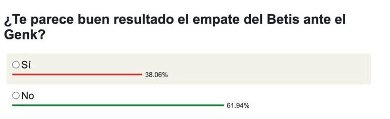 En ESTADIO, hemos querido preguntar a la afición del Real Betis por el empate conseguido en el estadio del Genk y su agrado o desagrado con el punto obtenido. El beticismo ha tenido una respuesta más igualada, pero decantándose más por el resultado de no estar contento con la renta obtenida, volviendo a coincidir un poco con la opinión de Manuel Pellegrini. El 61,94% de los votos creen que el empate no sirve de mucho para aspirar a grandes cotas, mientras que el 38,06% restante piensan que es un buen resultado para seguir vivos de cara a la clasificación final.