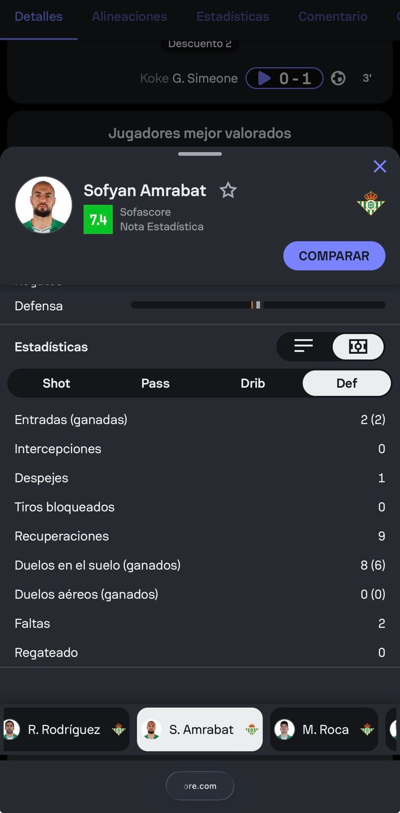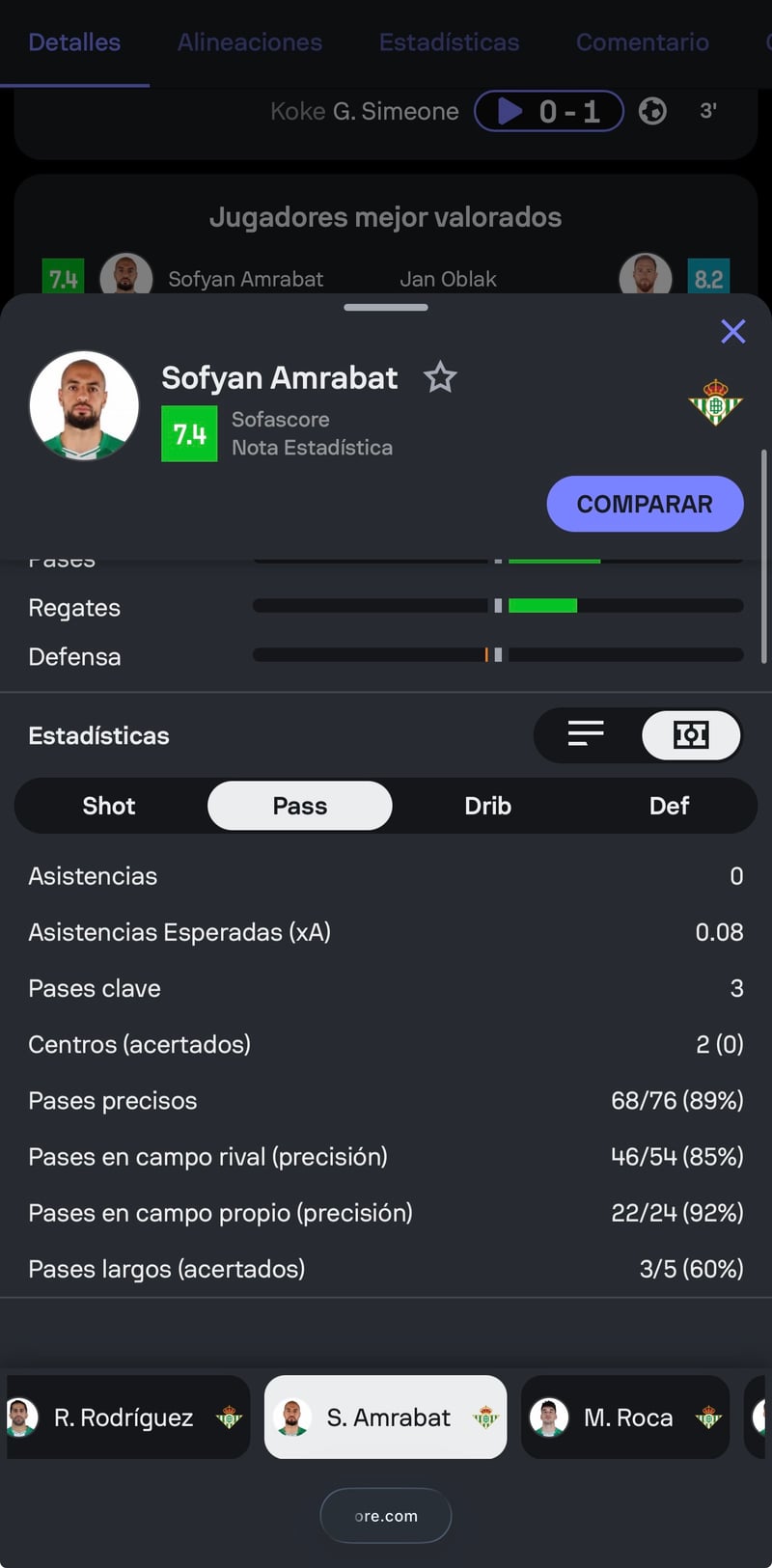 Las acciones de Amrabat supusieron un alivio para sus compañeros, pues liberó a Marc Roca, primero, y a Pablo Fornals, después, convertidos casi en mediapuntas, también el castellonense cuando ingresó Giovani Lo Celso por el catalán, para generar y para apretar arriba al Atlético de Madrid. Detrás, corrigió a la espalda de los centrales, Marc Bartra y Natan de Souza, incorporados muchas veces al ataque sin miedo, y de los laterales, Héctor Bellerín, Ricardo Rodríguez, Aitor Ruibal y Junior Firpo. Filtró pases, ganó posesiones, cortó ataques prometedores a Julián Álvarez, Nico González o Álex Baena... Omnipresente, el internacional con los 'Leones del Atlas' terminó viendo tarjeta amarilla no por sus acciones y faltas tácticas, sino, presa de la frustración, por protestar sobre la bocina un córner en el que claramente había dejado salir el balón erróneamente por la línea de fondo.