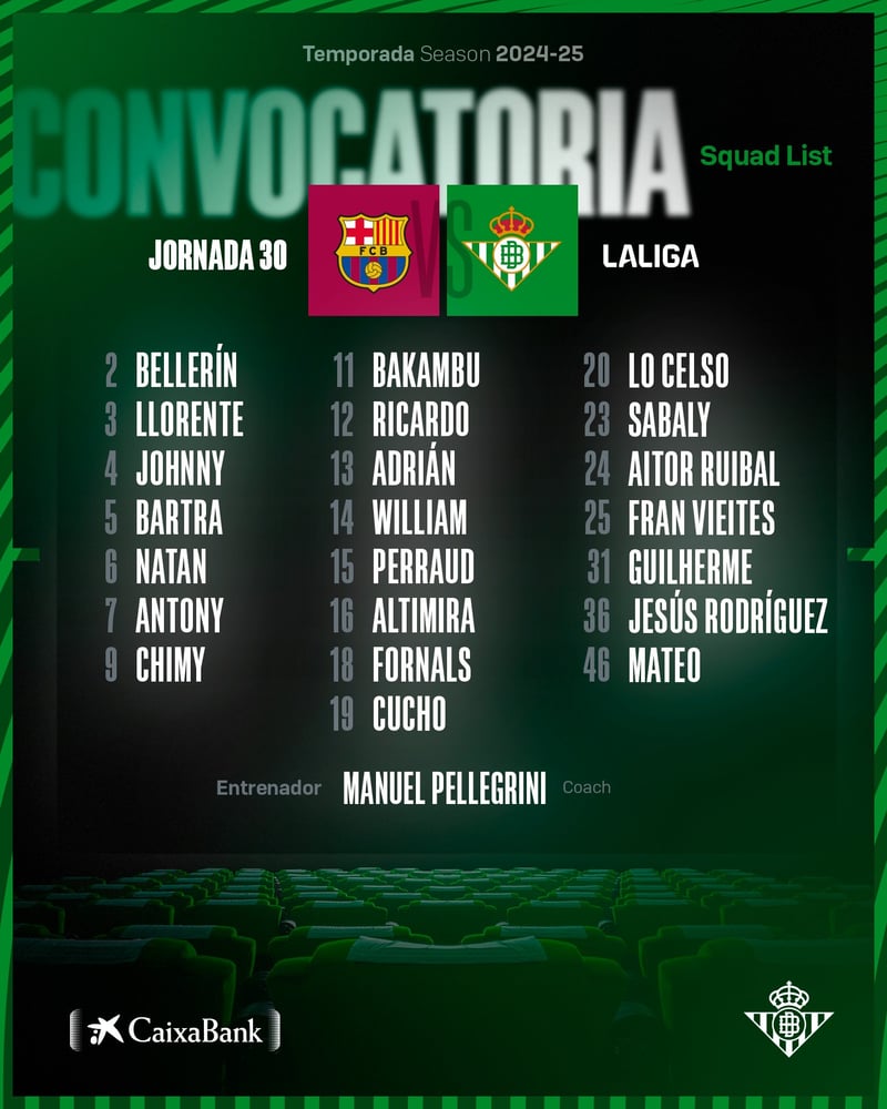 La citación completa está compuesta por los siguientes futbolistas: los porteros Adrián San Miguel, Fran Vieites y Guilherme Fernandes; los defensas Héctor Bellerín, Aitor Ruibal, Youssouf Sabaly, Marc Bartra, Diego Llorente, Natan de Souza, Romain Perraud y Ricardo Rodríguez; los centrocampistas Sergi Altimira, Johnny Cardoso, Mateo Flores, William Carvalho, Pablo Fornals, Giovani Lo Celso, Antony Matheus dos Santos, 'Chimy' Ávila y Jesús Rodríguez; y los delanteros Cédric Bakambu y 'Cucho' Hernández.