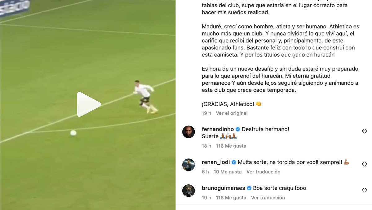 "Ahora es el momento de decir 'hasta pronto'. Han sido tres años inolvidables. Desde el primer momento en que pisé las dependencias del club supe que estaría en el lugar correcto para hacer mis sueños realidad. Maduré, crecí como hombres, deportista y ser humano. El Athletico es mucho más que un club. Y nunca olvidaré lo que viví aquí, el cariño que recibí del personal y, principalmente, de sus apasionados aficionados. Estoy bastante feliz de todo lo que construí con esta camiseta y con los títulos que gané con el 'Furaçao'. Es hora de un nuevo desafío y, sin duda, estaré muy preparado por lo que aprendí en Athletico-PR. Mi eterna gratitud permanece, e, incluso desde lejos, seguiré animando a este club que crece cada temporada", afirma el internacional olímpico, a quien su anterior club 'ha despachado' con mayor frialdad, sin aclarar su destino, sino simplemente agradeciéndole el esfuerzo y compromiso, deseándole suerte.