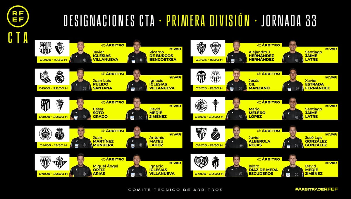La Real Federación Española de Fútbol (RFEF) ha dado a conocer en el día de hoy las designaciones arbitrales para la jornada 32 de LaLiga que comenzará este mismo martes 2 de mayo y que finalizará el jueves día 4 de mayo al disputarse la final de Copa del Rey este sábado en el Estadio de La Cartuja entre Real Madrid y Osasuna.