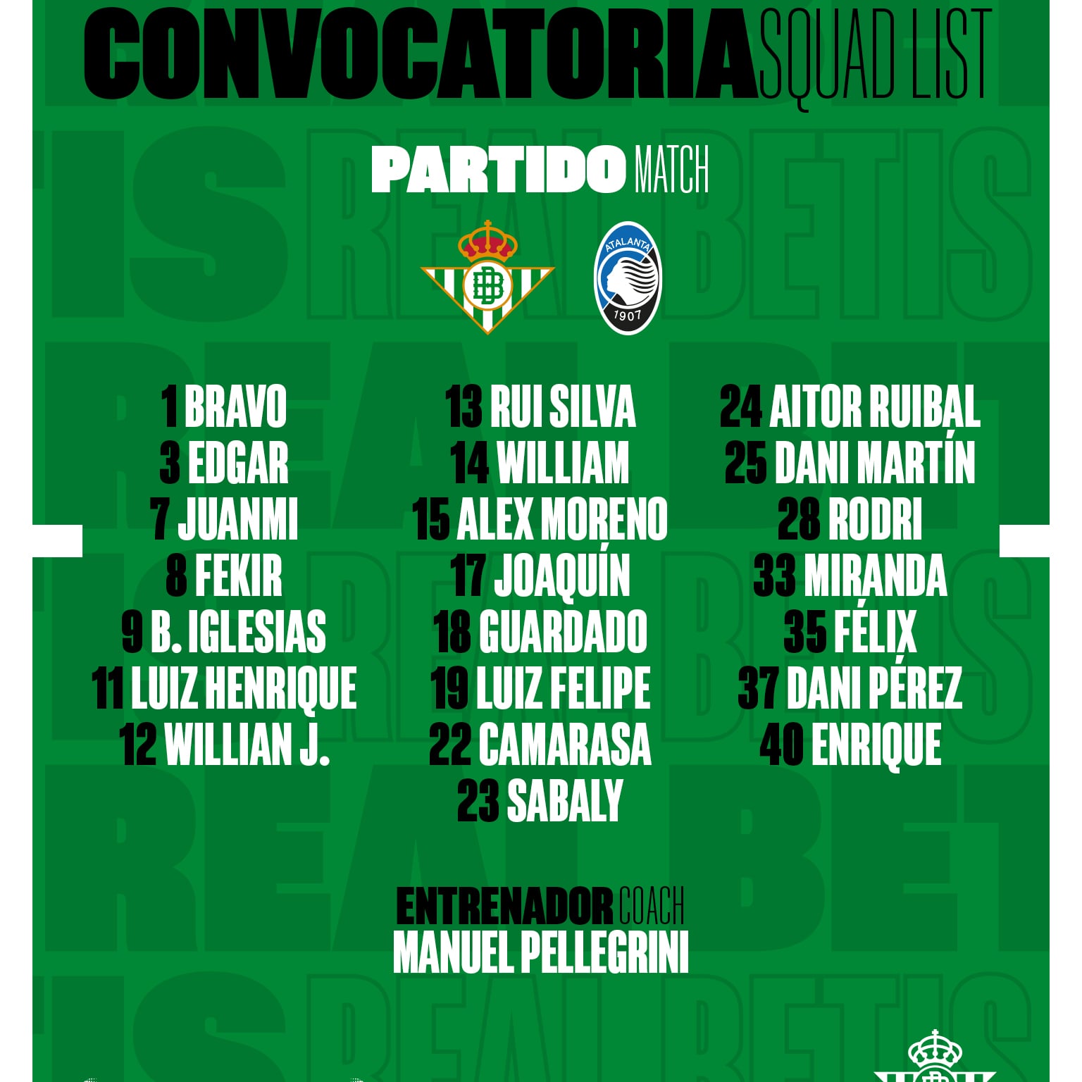 Así, la lista de convocados completa es la siguiente: Claudio Bravo, Edgar, Juanmi, Fekir, Borja Iglesias, Luiz Henrique, Willian José, Rui Silva, William Carvalho, Álex Moreno, Joaquín, Guardado, Luiz Felipe, Camarasa, Sabaly, Aitor Ruibal, Dani Martín, Rodri, Miranda, Félix, Dani Pérez, Enrique.