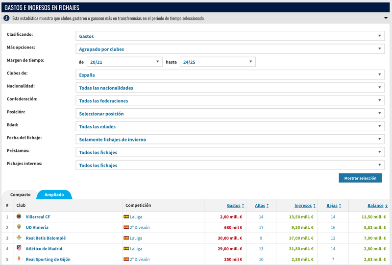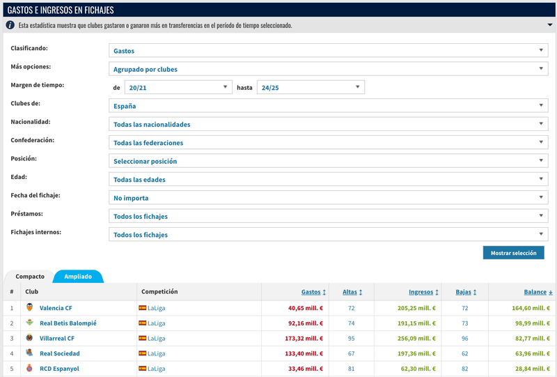 En LaLiga, sólo el Valencia tiene un balance más positivo entre gastos e ingresos en fichajes en lo que va de década que el Betis, también en el podio considerando sólo el mercado invernal