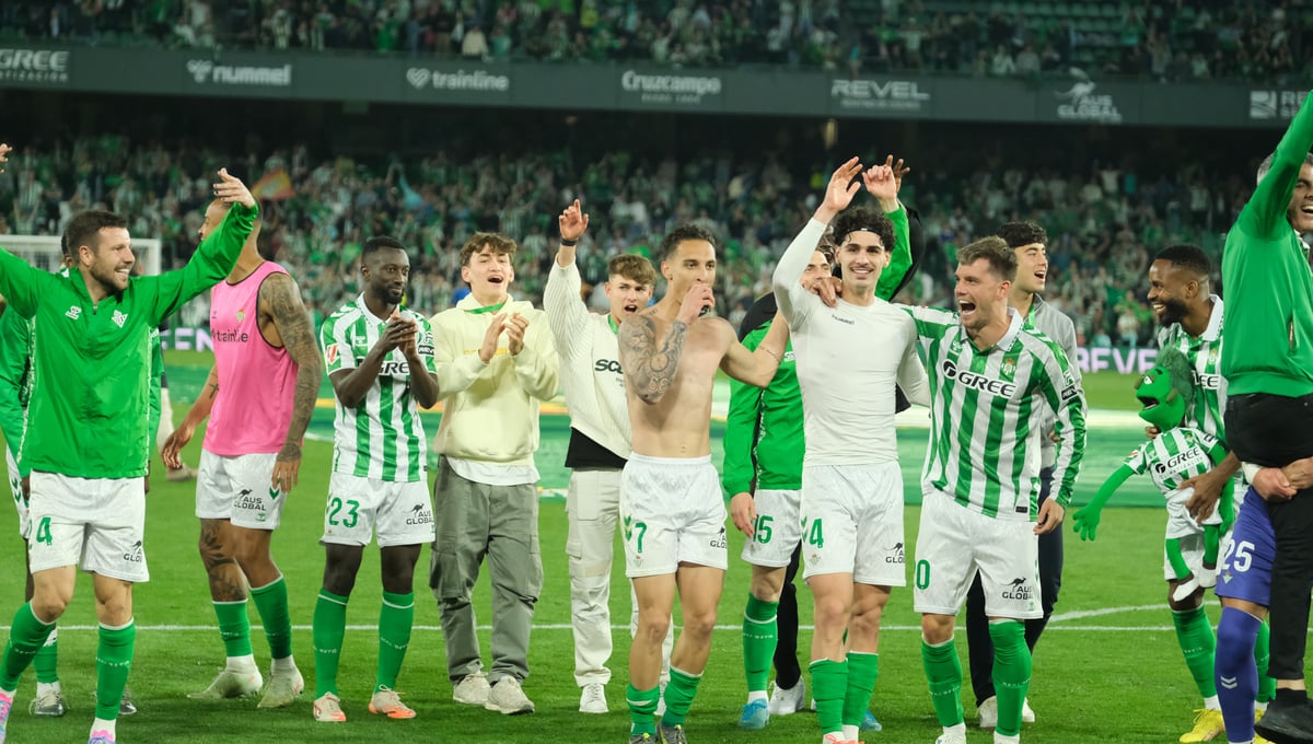 El aljarafeño y el extremeño, vestidos de calle junto a Sabaly, celebran con la primera plantilla la victoria en el derbi.Lince