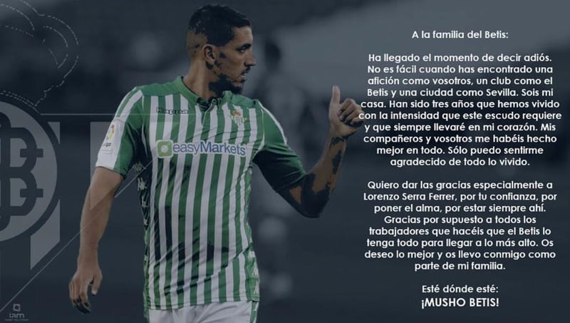 El jugador es muy querido por los aficionados béticos, no en vano hizo gala de su beticismo y tuvo algún encontronazo con aficionados del eterno rival por sus mensajes en redes sociales. Precisamente, uno de ellos en redes sociales está dando que hablar en las últimas horas y ha levantado todo tipo de especulaciones.