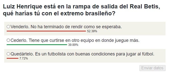 Casi un 40% (39,89) preferiría cederlo antes que desprenderse de él definitivamente, para así darle los minutos y la continuidad que no puede tener ahora mismo en el Betis. Tan sólo un 7,72% no lo vendería ni lo cedería ya que confía en que pueda demostrar su valía en esta segunda parte de la temporada. La entente entre la dirección deportiva y la afición del Betis en el caso de Luiz Henrique, al menos, es total.