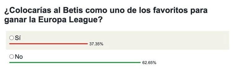 Por eso, en Estadio Deportivo hemos querido preguntar a la afición bética si creen que este Betis, que además tiene que recuperar a su mejor jugador, puede aspirar a ser uno de los favoritos para ganar la competición. La respuesta ha estado apretada hasta el último momento, pero los aficionados verdiblancos se han decantado por el 'no'. El 62,65% de los votos no colocarían al Betis como una de los favoritos para poder luchar por la Europa League mientras que el 37,35% restante si creen que pueda estar en esa terna de equipos que pueden optar al título. El paso de las jornadas irán marcando el camino del equipo de Pellegrini y sus opciones.