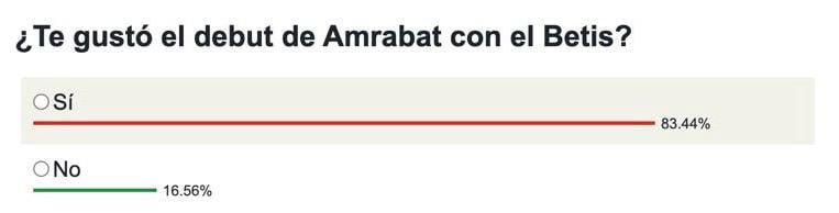 Por eso, en Estadio Deportivo hemos querido preguntar a la afición qué le pareció su debut con la elástica verdiblanca. La respuesta por parte de la afición bética ha sido muy contundente: quedaron encantados con sus minutos. El 83,44% de los votos han afirmado que quedaron muy contentos con el debut del jugador marroquí en las filas de Manuel Pellegrini. Sólo el 16,56% no quedaron convencidos de su nivel en la primera prueba del centrocampista como nuevo jugador del Real Betis. Ya veremos si consigue robarle protagonismo al, hasta ahora, centro del campo habitual con Altimira y Fornals.