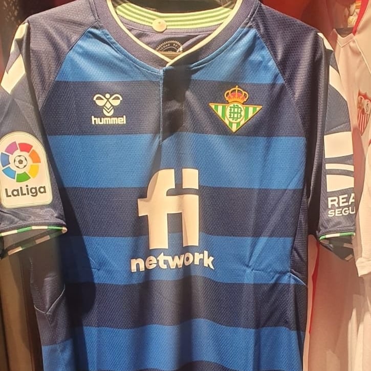 Siendo predominante dos tonos de azul a barras horizontales, esta camiseta recuerda a otras del pasado que ya vistió el Real Betis. La casaca también se adecua a la normativa UEFA para que haya una diferencia palpable entre los colores de la primera y la segunda.
