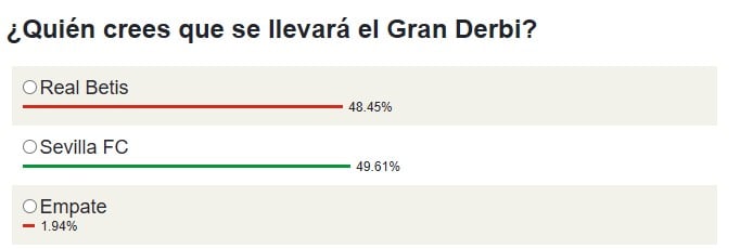 Al respecto, ESTADIO Deportivo ha llevado a cabo una encuesta entre sus lectores. ¿Quién será el ganador del derbi? Y el resultado es el lógico en una ciudad como Sevilla, tan repartida entre uno y otro equipo. Si en los días previos al encuentro parecía que era el triunfo bético el que se imponía ligeramente, en las horas previas al partido de este domingo todo se ha igualado.