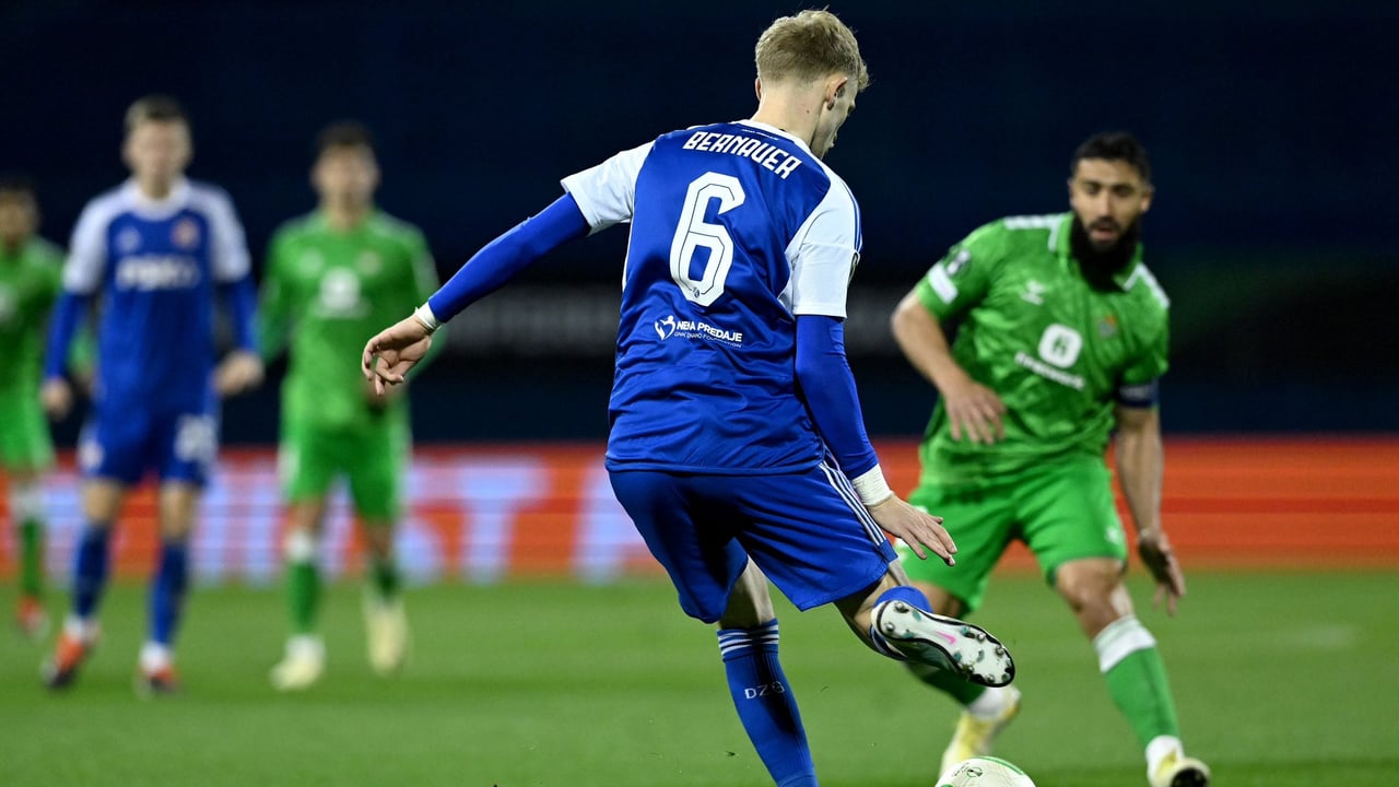 Fekir intenta cortar un despeje del central del Dinamo Bernauer.@gnkdinamo
