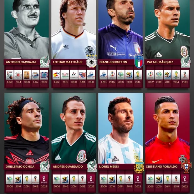 En la cita mundialista de Qatar, además de Andrés Guardado otro mexicano como Ochoa ha alcanzado la cifra de cinco mundiales, así como Leo Messi y Cristiano Ronaldo. Todavía ninguno ha llegado a la cifra de seis y parece complicado que alguno de estos pueda lograrlo.