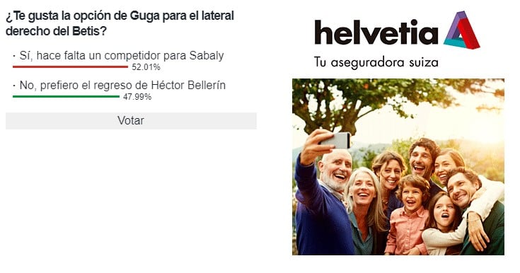 A día de hoy, son las dos opciones conocidas para hacer competencia a Sabaly, ¿pero cuál de ellas prefiere la afición? Pues la hinchada verdiblanca esta muy dividida a tenor de los resultados arrojados por nuestra #EncuestaHelvetiaED, por la que un 52% apostaría por el brasileño Guga para la próxima temporada, mientras que un 48% preferiría el regreso de Bellerín. El beticismo se ha manifestado, aunque la decisión final está en manos del propio Betis.