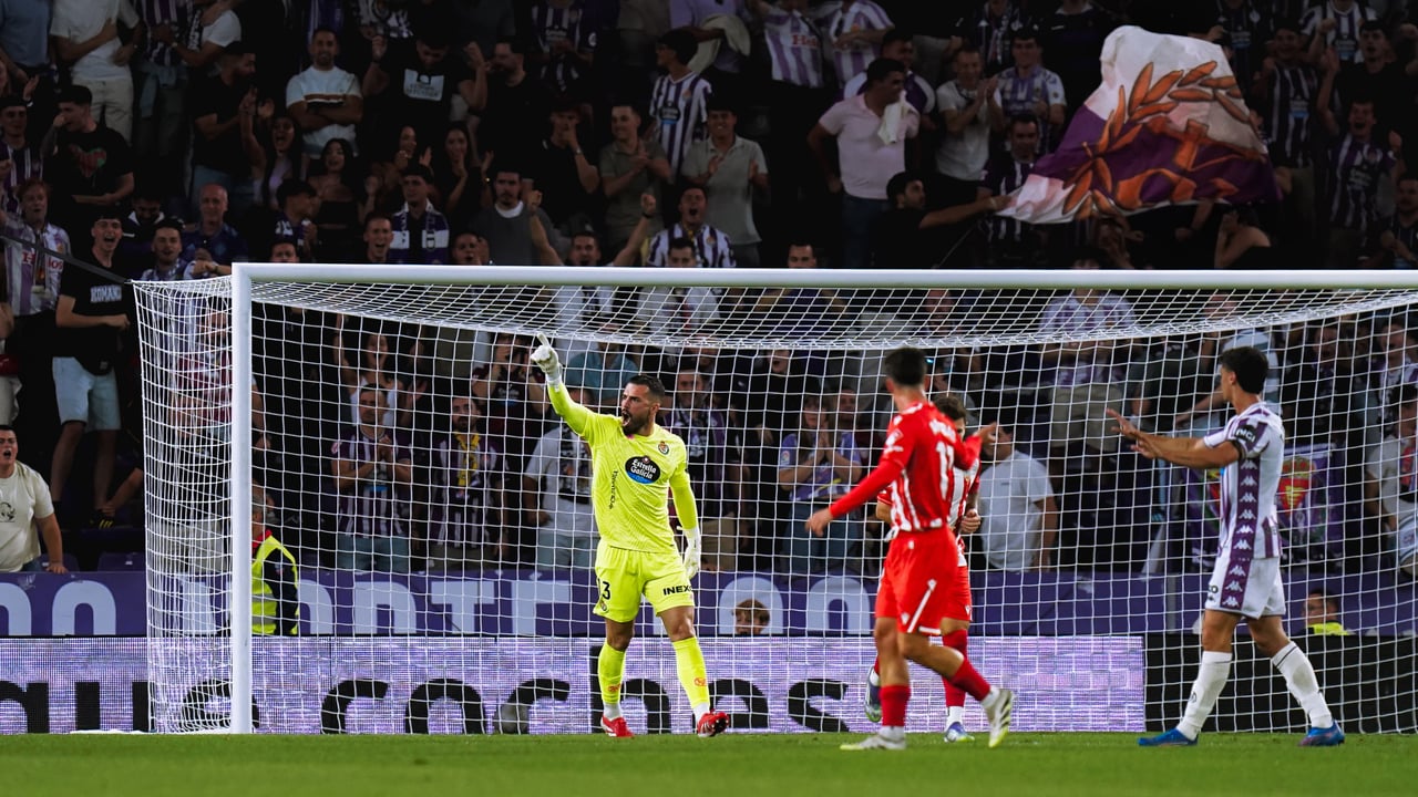 Suma y sigue el Real Valladolid, invicto tras la disputa de las cinco primeras jornadas de LaLiga Hypermotion. Alcanza ya los once puntos uno de los máximos favoritos al ascenso, merced a tres victorias y dos empates que le sitúan en la parte de la clasificación, superado de momento sólo por el Racing de Santander (que hizo pleno en sus cuatro partidos iniciales) y empatado con Cádiz CF y Deportivo de La Coruña. El único que podrá rebasarle este domingo, si se impone en Gijón a partir de las 18:30 horas al Real Burgos, será el Real Sporting, cuyo guardameta Rubén Yáñez es el único que mantiene el pulso como Zamora de la categoría con Guilherme Fernandes. El luso, imbatido en las tres primeras entregas del campeonato, únicamente ha encajado un tanto en las dos siguientes, convirtiéndose en un bastión para que los albivioletas continúen invictos y sean, como los asturianos (éstos, con un duelo menos al cierre de esta edición), los que menos encajan.