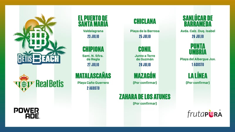 Esta iniciativa arrancará el próximo martes 23 de julio en El Puerto de Santa María como primera parada y continuará en Chiclana (25 de julio), Sanlúcar de Barrameda (26 de julio), Chipiona (27 de julio), Conil (28 de julio), Punta Umbría (1 de agosto), Matalascañas (2 de agosto) -todos ya confirmados-, mientras que podrían sumarse próximamente los enclaves gaditanos de La Línea de la Concepción y Zahara de los Atunes, así como el onubense de Mazagón, con fechas aún por confirmar, pues se están tramitando todos los detalles con los gobiernos municipales y los organizadores, por lo que pronto se conocerán más destinos. Estos eventos 'Betis Beach' mantendrán sus puertas abiertas, en horario matinal, entre las 12:00 y 15:00 horas -sólo con el stand de productos oficiales-, y en turno vespertino, entre las 17:00 y 22:00 horas, para el resto de las actividades.