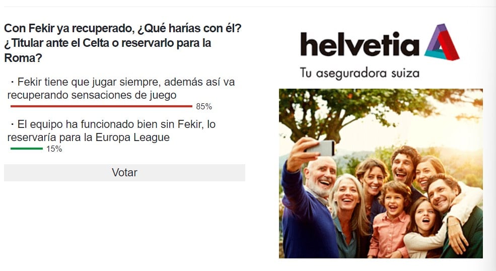 Sin embargo, un 15% se muestra más cauteloso y es partidario de no forzar la vuelta de Fekir tan pronto, pues el equipo está jugando bien y no lo está echando de menos, por lo que lo reservaría para darle minutos en la cita europea ante los de José Mourinho, que buscarán ganar al Betis para empatarles en lo más alto del grupo C de la Europa League, que ahora mismo está en poder del Betis con seis puntos tras sus triunfos ante el HFK Helsinki y el Ludogorets.