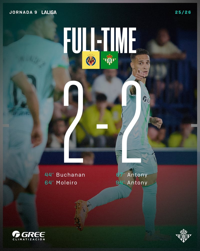 El Real Betis logró un valiosísimo punto en su visita al Estadio de la Cerámica ante un rival directo como el Villarreal gracias a dos zarpazos del brasileño Antony en la segunda parte cuando las cosas se ponían más feas para el equipo de Pellegrini. Tras el 2-0 de Moleiro parecía que sacar algo positivo del feudo amarillo iba a ser imposible pero entonces apareció el '7' verdiblanco para recortar distancias casi sin tiempo para que el Villarreal pudiera celebrar su segundo gol.