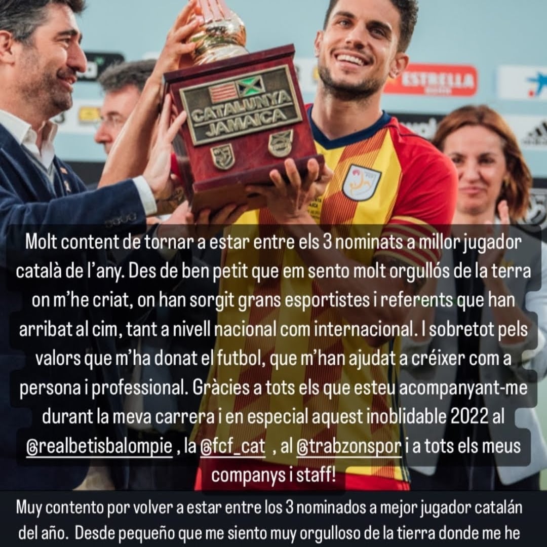 "Muy contento por volver a estar entre los tres nominados a mejor futbolista catalán del año. Desde pequeño me siento muy orgulloso de la tierra en la que me he criado, donde han surgido grandes deportistas y referentes que han llegado a la cima, tanto a nivel nacional como internacional. Y, sobre todo, por los valores que me ha dado el fútbol, que me han ayudado a crecer como persona y como profesional. Gracias a todos los que estáis acompañándome durante mi carrera y en especial en este inolvidable 2022 en el Real Betis, la selección catalana y el Trabzonspor. ¡Gracias a todos los compañeros y staff!", explicó Marc Bartra, quien ya ha reconocido que, aunque se siente muy bien en Turquía, no quería dejar Heliópolis bajo ningún concepto.