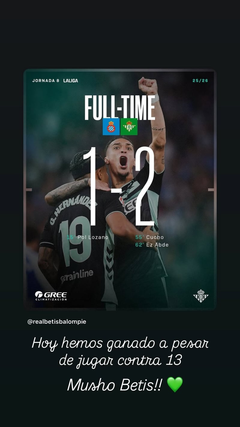 Se desahogó y se quedó a gusto Joaquín Sánchez tras el sufrido 1-2 en Cornellà-El Prat, que celebró utilizando el gráfico con el que las redes oficiales de la entidad festejaron el final del encuentro ante el RCD Espanyol, acompañadas de dos frases categóricas con indudable referencia a los árbitros, tanto el que estaba en el campo con presunto mando en plaza como el que lo asistía desde la sala VOR de Las Rozas y lo indujo a consultar el monitor en la acción final entre Valentín Gómez y Leandro Cabrera, con Roberto Fernández como protagonista secundario e ignorado. "Hoy hemos ganado a pesar de jugar contra 13. Mucho Betis!!", apuntaba el otrora atacante, junto a un corazón verde, el suyo mismo.