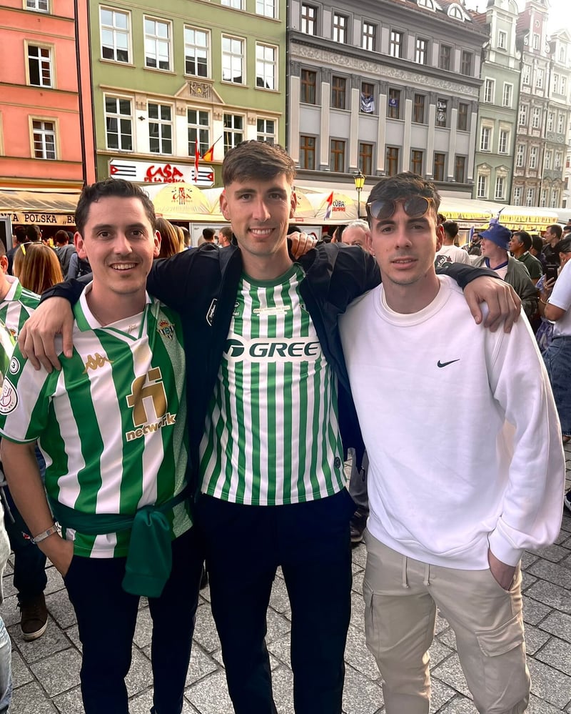 "Puede ser que se sienta eso como algo que no es habitual. Es verdad; pero yo no lo sentí así. Siempre había querido viajar porque antes pues no podía permitírmelo. Cuando el Betis llegó a la final, yo estaba de vacaciones. Hablé con el Bolonia, no pusieron ningún problema, y yo nunca había hecho viajes con el Betis. Bueno, de muy pequeño, pero ya ni me acuerdo. Creo que era el momento de estar en la grada, con mis amigos, con mi familia... Era el momento de vivir algo diferente. Siempre le digo a mis amigos que, cuando me retire del fútbol, estoy deseando hacer más viajes. Viajar viendo fútbol con mis amigos, que viajan siempre".