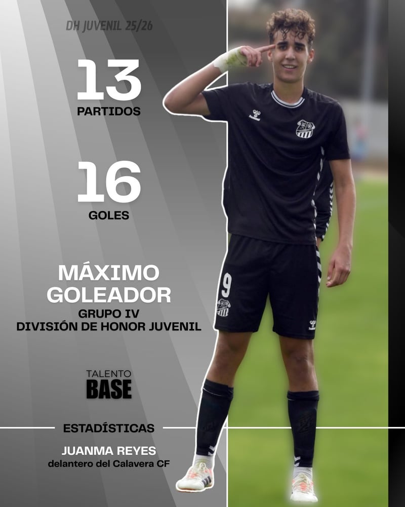 Juanma Reyes es, de largo, el máximo anotador de los siete grupos de División de Honor Juvenil, seguido de lejos (con 12 dianas ambos, cuatro menos que él) por Aleix Enríquez, del Levante UD, y Manuel Mesa, del citado UD La Mosca. Con 11 están Jorge Pérez (RC Celta de Vigo) y Ayman El Hahaoui (Rayo Vallecano). Por si fuera poco, el bético ha repartido ya cinco asistencias, por lo que el sello que dejó este verano durante la Best Cup y el Mundialito está más que justificado. Ahora, su próximo reto está en rebasar los 22 tantos con que otro igual como Jorge Luis Rodríguez, ahora cedido en el Arenas de Getxo, se convirtió en el máximo anotador de la historia del Calavera CF en una temporada en juveniles.