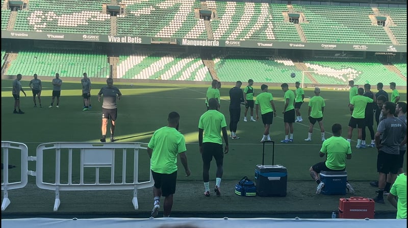 El director deportivo presenció la sesión tras recibir a Natan en el aeropuerto y mantuvo varias conversaciones con el entrenador bético. Bellerín fue baja por una indisposición que a priori no le impedirá formar parte de la convocatoria