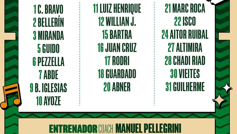 Así, los 22 convocados por el técnico chileno son Claudio Bravo, Fran Vieites, Guilherme, Héctor Bellerín, Aitor Ruibal, Juan Miranda, Chadi Riad, Abner Vinicius, Marc Bartra, Pezzella, Guardado, Guido Rodríguez, Marc Roca, Ez Abde, Isco Alarcón, Altimira, Juan Cruz, Rodri, Ayoze, Luiz Henrique, Borja Iglesias y Willian José.