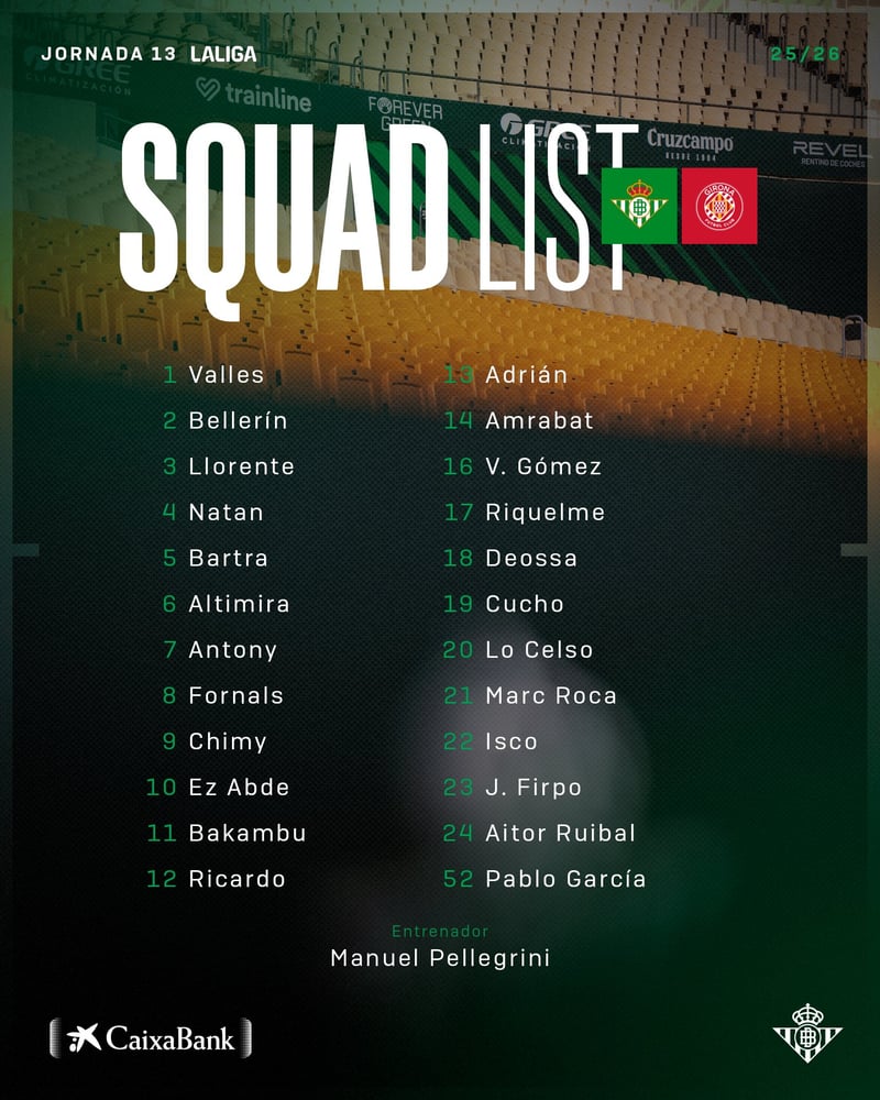 Así las cosas, la lista al completo con los 24 futbolistas convocados por Manuel Pellegrini para el partido de la jornada 13 de LaLiga EA Sports entre el Real Betis y el Girona FC es la compuesta por los porteros Álvaro Valles y Adrián San Miguel; los defensas Héctor Bellerín, Aitor Ruibal, Marc Bartra, Diego Llorente, Natan de Souza, Valentín Gómez, Ricardo Rodríguez y Junior Firpo; los centrocampistas Sofyan Amrabat, Marc Roca, Sergi Altimira, Pablo Fornals y Giovani Lo Celso; y los atacantes Antony dos Santos, Chimy Ávila, Ez Abde, Rodrigo Riquelme, Pablo García, Cédric Bakambu y el 'Cucho' Hernández.