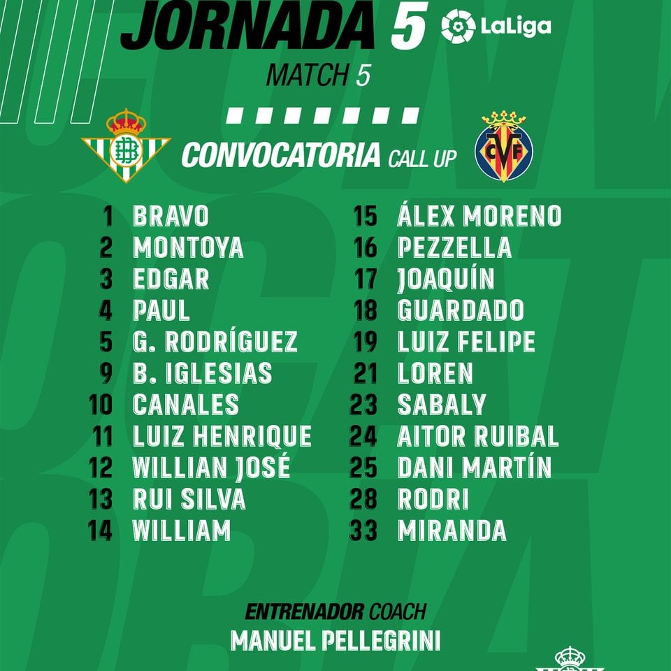 Pellegrini volverá a hacer muchos cambios tras cambiar a todo el equipo entre semana. La lista de 22 futbolistas es la siguiente: Claudio Bravo, Martín Montoya, Edgar, Paul, Guido Rodríguez, Borja Iglesias, Sergio Canales, Luiz Henrique, Willian José, Rui Silva, William Carvalho, Álex Moreno, Pezzella, Joaquín, Guardado, Luiz Felipe, Loren Morón, Sabaly, Aitor Ruibal, Dani Martín, Rodri y Miranda.