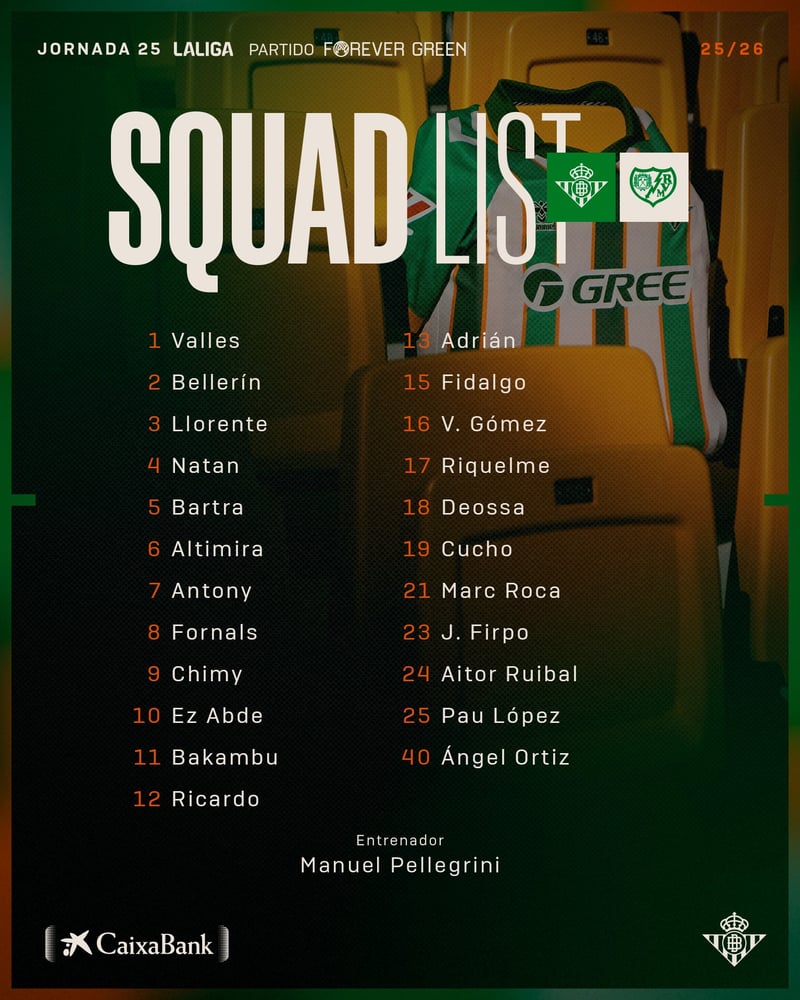 La lista completa de 23 futbolistas convocados para el Real Betis-Rayo Vallecano de este sábado 21 de febrero a las 18:30 horas en el Estadio de La Cartuja es la conformada por los siguientes efectivos: los porteros Álvaro Valles, Pau López y Adrián San Miguel; los defensas Héctor Bellerín, Ángel Ortiz, Aitor Ruibal, Diego Llorente, Marc Bartra, Natan de Souza, Valentín Gómez, Junior Firpo y Ricardo Rodríguez; los centrocampistas Sergi Altimira, Marc Roca, Pablo Fornals, Nelson Deossa, Álvaro Fidalgo, Antony Matheus dos Santos, Ez Abde y Rodrigo Riquelme; y los delanteros 'Chimy' Ávila, 'Cucho' Hernández y Cédric Bakambu.