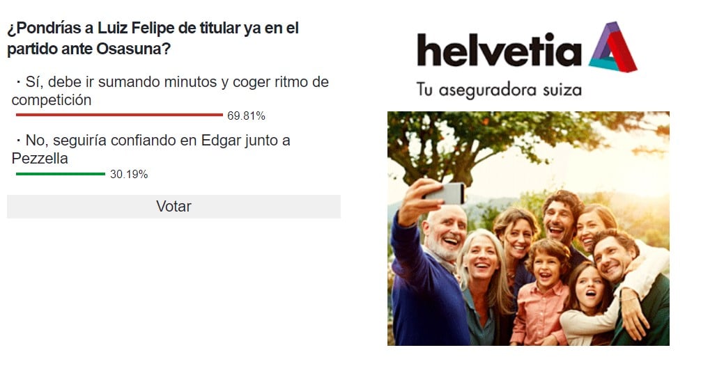 En cambio, un 30,19% se muestra más precavido y prefiere esperar para ir dándole entrada en el once, pues tanto Pezzella y sobre todo Edgar, que apuntaría a ser el sacrificado de entrar Luiz Felipe, han rendido a un gran nivel en estos dos primeros partidos de la temporada. Sin embargo, a tenor de lo votado parece que la hora de Luiz Felipe ha llegado...