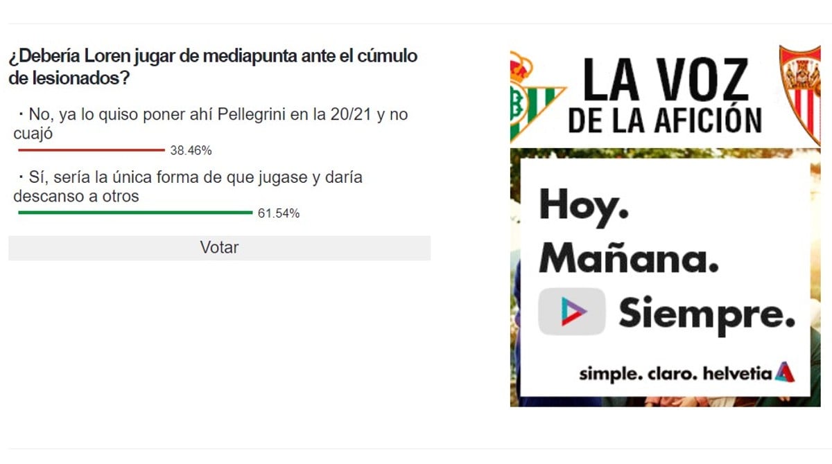 Jugar ahí sería una opción para recuperarlo y sacarlo del ostracismo. Así lo entienden los aficionados béticos y según han expresado a través de la #EncuestaHelvetia, prefieren verlo ahí que sin jugar y en el banquillo.