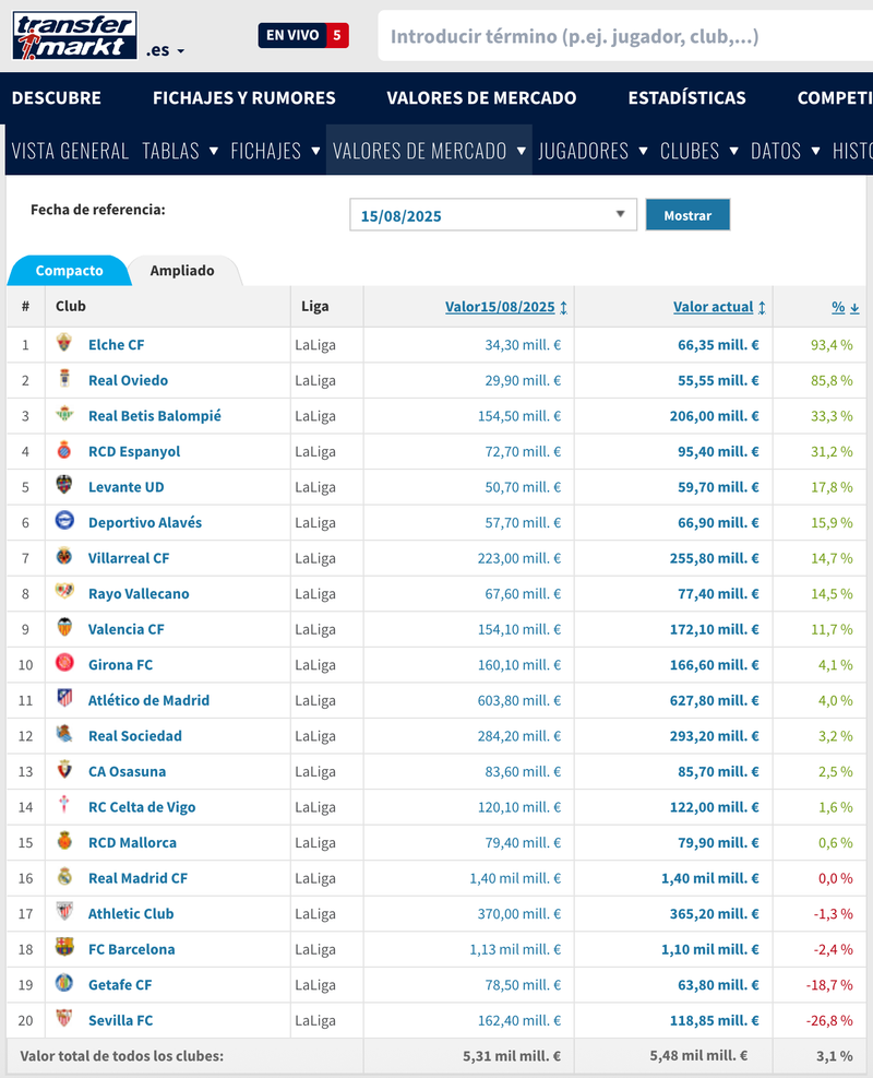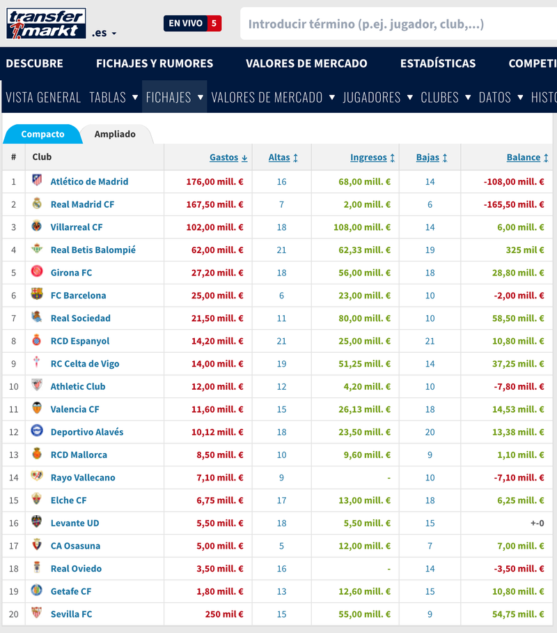 Igualmente, sólo tres conjuntos (los castellonenses, la Real Sociedad y los colchoneros) han ingresado más que los nuevos moradores de La Cartuja (62,33 millones), que se distinguen como los que mejor ajustaron para mantenerse en la regla 1:1 sin dejar prácticamente nada en la caja (325.000 euros de superávit). Hasta seis rivales presentan un balance de entradas y salidas deficitario (casos de FC Barcelona, Real Oviedo, Athletic Club, Rayo Vallecano, Atlético de Madrid y Real Madrid), si bien el adiestrado por el el 'Ingeniero' es 'Top 3' de revalorizaciones tras el de 'deadline day', con un 33,3d% más (de 154,5 a 206 millones de euros), por detrás de ilicitanos (93,4% más) y carbayones (85,8% más), si bien no le sirve para escalar en la clasificación elaborada por el sitio originario de Alemania: los verdiblancos son los séptimos de España en cotización, con merengues, culés, colchoneros, vizcaínos, donostiarras y castellonenses por delante.
