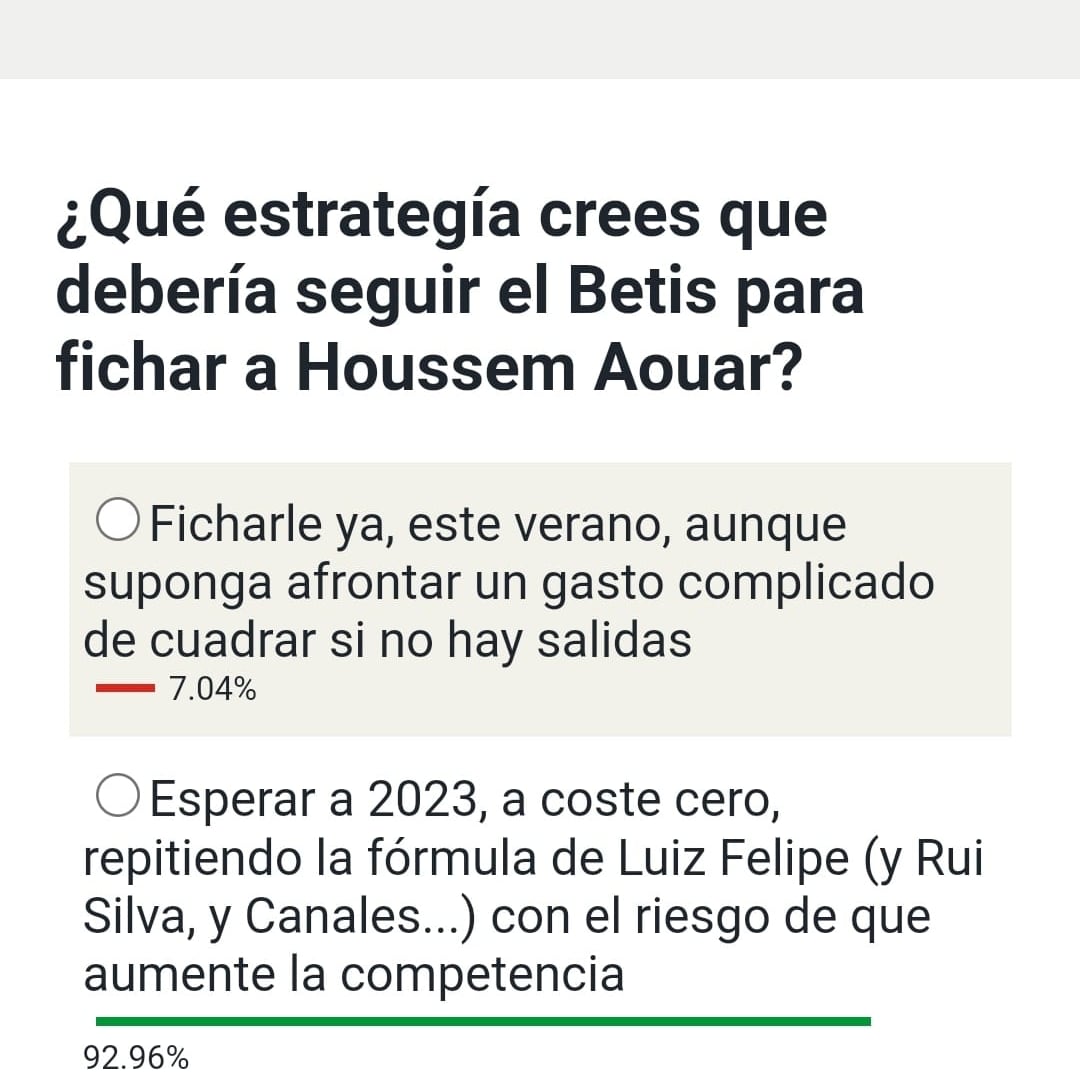 En este sentido, preguntados por este periódico en la #EncuestaHelvetiaED, casi un 93 por ciento de los encuestados se muestran partidarios de repetir una fórmula que al Betis le funcionó muy bien con jugadores como Sergio Canales, Rui Silva, Pau López o el propio Luiz Felipe, presentado oficialmente hoy. Consistiría en esperar un año y hacerse con Aouar a coste cero, asumiendo el riesgo de un aumento de la competencia que pueda estropear la estrategia. El 7 por ciento restante, en cambio, aboga por ficharle ya este verano, aunque suponga un gasto complicado de cuadrar económicamente.