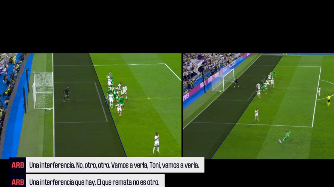 De nada sirve que haya, como se ha apuntado, esa captura perfecta que avale la decisión de anular el 0-1 si, a la hora de visualizarla, Díaz de Mera Escuderos no la tiene para juzgar, sino que lo hace sobre otras erróneas. Pero es que el diálogo del de Daimiel con su ayudante en Las Rozas, Jaime Latre, cabrea hasta en un duelo intrascendente como el de la última jornada de LaLiga en Chamartín. "Isidro, te recomiendo un 'on field review' porque el jugador Marc Roca hace el gesto de rematar y puede interferir en el portero", clama el aragonés, que añade: "Vas a ver las líneas cuando vengas y luego te pondré la 'net cam' para que veas el movimiento". Cuando se dirige hacia el monitor, el manchego habla con Kroos y varios béticos: "Una interferencia hay, pero no del que remata, de otro. Vamos a verla, Toni, vamos a verla". A continuación, pide a sus compañeros: "No lo muevas, que está la pantalla como rota".