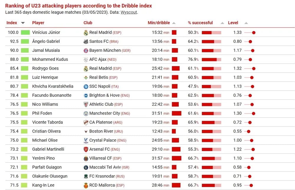 En el 'Top 10' de mejores regateadores jóvenes del mundo, en LaLiga solamente el madridista Vinicius tiene un mejor promedio de 'dribblings' por minutos jugados; es el tercero en índice de acierto