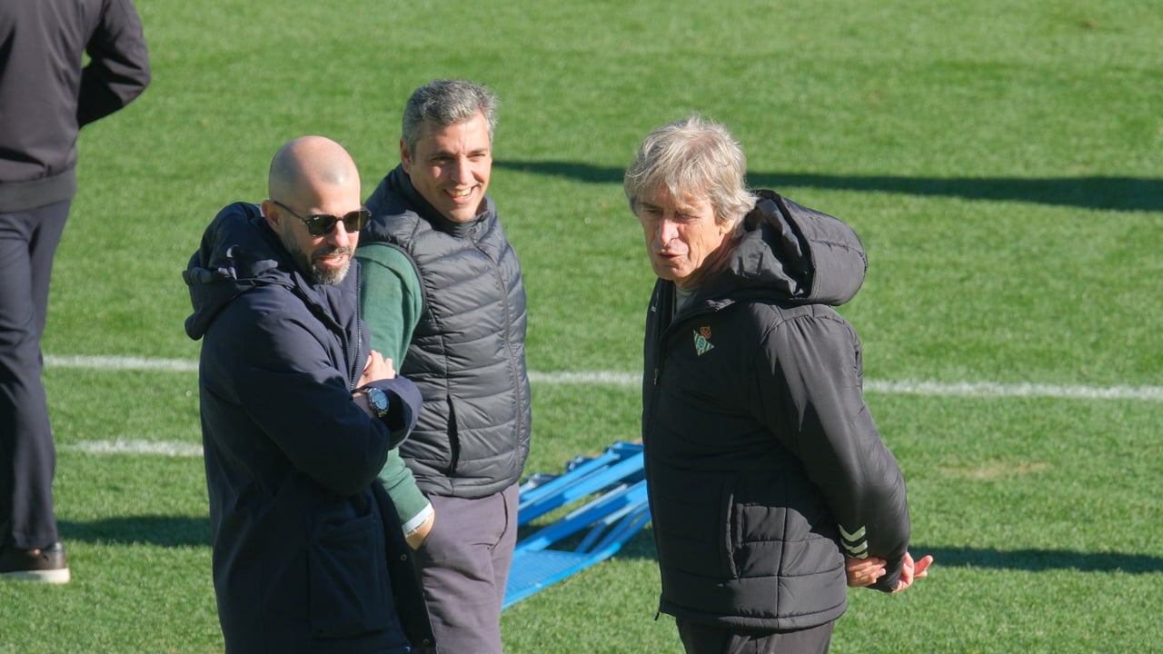 Manu Fajardo y Manuel Pellegrini bromean durante un entrenamiento del Real Betis en el Benito Villamarín.Lince