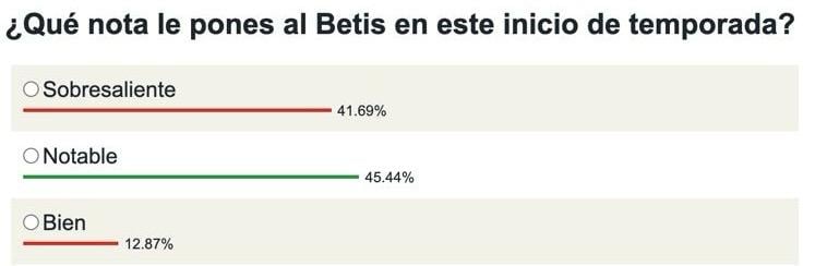 En Estadio Deportivo hemos querido preguntar a la afición del Real Betis qué nota le pondrían al equipo tras las primeras ocho jornadas de LALIGA y las dos primeras de la Europa League y el resultado ha estado muy dividido. El 45,44% de los votantes creen que el notable es la nota más apropiada hasta el momento. En segundo lugar se encuentra el sobresaliente con un 41,69% de los votos. Por último, los más exigentes, un 12,87%, le ponen un bien a la plantilla verdiblanca. El aficionado heliopolitano está contento, pero aún ve margen de mejora para llegar a la puntuación máxima.