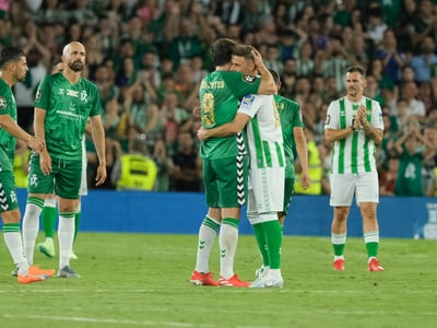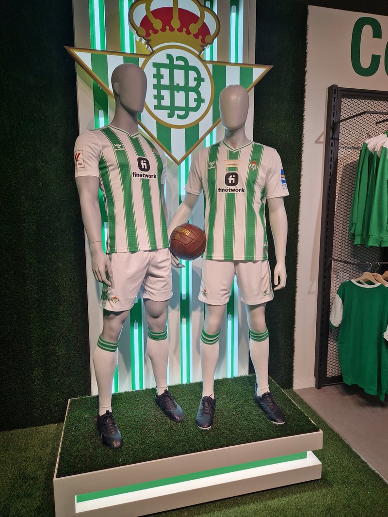 Así las cosas, se pueden observar dos maniquíes ataviados con la primera equipación de la 23/24, uno de ellos con el parche en el pecho del citado encuentro de homenaje al 'Eterno 17' y sosteniendo un balón, el otro con los parches en el hombro de la Europa League. Los dos presentan las medias blancas de bordes verdes, una combinación inédita hasta la fecha que, según los responsables de la tienda, será la elegida para que el conjunto adiestrado por Manuel Pellegrini afronte los duelos como local y varios de los de fuera, si bien este diseño provocará más confusiones de lo habitual, por lo que las indumentarias visitantes, que todavía no se han presentado, habrán de aparecer a menudo, por ejemplo en las visitas a Real Sociedad, Celta, Real Madrid... donde el calzón negro era suficiente distinción como para no tener que alterar más la combinación titular.
