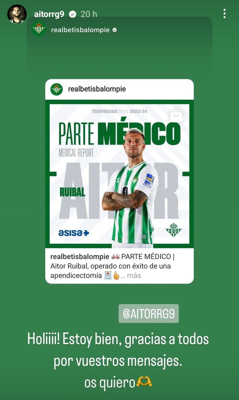 Si todo va bien, Aitor Ruibal sólo se perderá un máximo de cuatro partidos: el choque del domingo ante los vallecanos, el de la visita al FC Barcelona y el duelo en casa contra el Cádiz CF de mediados y finales de septiembre y, entre medias, el de la primera jornada de la Fase de Grupos de la Europa League. Desde la cama del hospital, recién recuperado de los efectos de la anestesia, Aitor Ruibal aprovechó las 'stories' de su perfil de Instagram para mostrar gratitud ante el aluvión de mensajes enviándole ánimos y una pronta recuperación. "Holi, estoy bien. Gracias a todos por los mensajes. Os quiero", escribió el polivalente futbolista, que compartió también una fotografía que había publicado su pareja, Anabel Barrau.