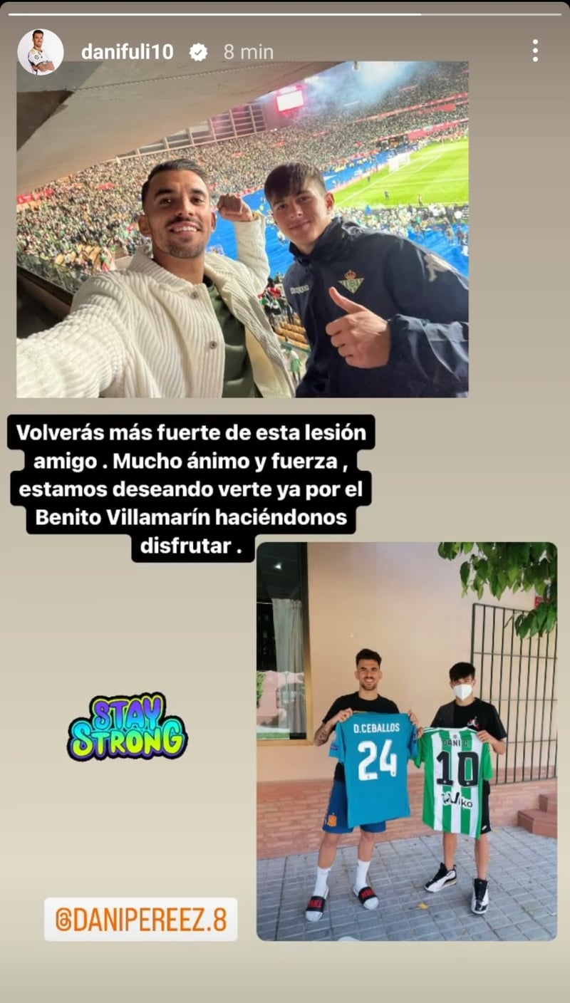 "Volverás más fuerte de esta lesión. Mucho ánimo y fuerza. Estamos deseando verte ya por el Benito Villamarín haciéndonos disfrutar", ha escrito Dani Ceballos a Dani Pérez en una de sus cuentas de redes sociales.