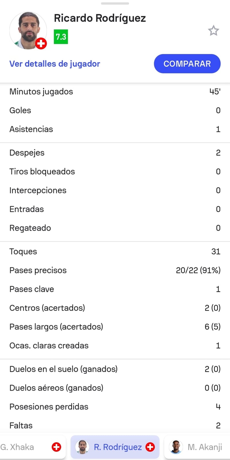 En su tiempo sobre el terreno de juego rindió a un alto nivel como demuestran las estadísticas, sobre todo en el apartado ofensivo. De hecho, completó cinco de los seis pases largo intentados, dio un pase clave y generó una ocasión clara de gol, la del 0-1 suizo.