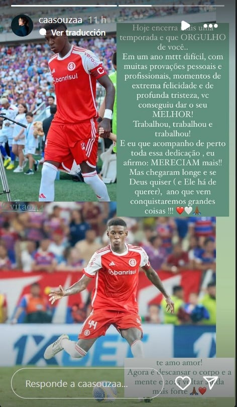 Y en segundo lugar, Camila Souza habla sobre el futuro del zaguero y, aunque no concreta, sí que vaticina un crecimiento profesional que podría ser más allá del internacional de Porto Alegre: "Has recorrido un largo camino y si Dios quiere, que seguro que será así, el año que viene conseguido grandes cosas. Ahora a descansar cuerpo y mente para regresar más fuerte". Un mensaje que contó con el respaldo de Vitao, que lo compartió en redes sociales y añadió una respuesta: "Te amo, muchas gracias por todo".