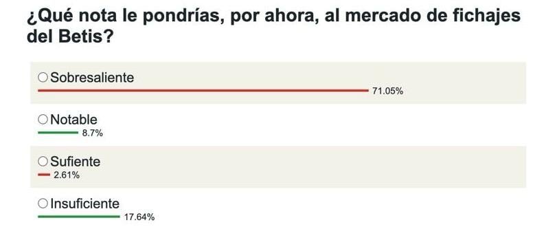 La respuesta del beticismo ha sido muy positiva. Entre las cuatro opciones para los votantes se encontraban: sobresaliente, notable, suficiente e insuficiente. El 71,05% de los aficionados verdiblancos han votado la primera elección y le ponen un sobresaliente a la acción de Fajardo y compañía. Por el contrario, la segunda más elegida ha sido la de insuficiente con un 17,64%. Siempre hay opiniones para todo. Las otras dos opciones se han cerrado con un 2,61% para el suficiente y 8,7% para el notable.