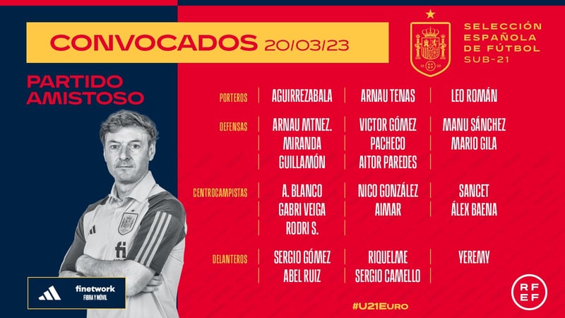 Una convocatoria formada por 23 jugadores y que no cuenta con Bryan Gil, quien sí fue llamado este viernes por Luis de la Fuente para la absoluta, al igual que Alejandro Balde.