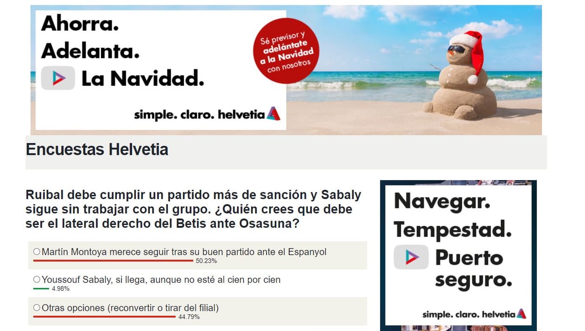 El concurso en Pamplona del lateral derecho senegalés se antoja difícil y Aitor Ruibal aún debe cumplir un partido más de sanción, por lo que todo apunta a que Montoya repetirá titularidad. Si hace justo una semana, el pasado día 12, una mayoría de votantes en la #EncuestaHelvetiaED preferían al capitán del Betis Deportivo, Fran Delgado, sólo una semana después el catalán ha recibido el apoyo de uno de cada dos participantes de cara a su permanencia en el once del Betis.