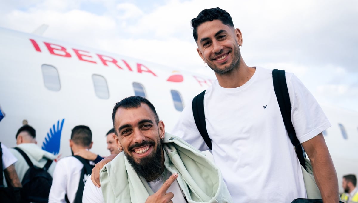 El '10' posa sonriente junto a Borja Iglesias, su sustituto en el Coliseum, antes de embarcar el viernes hacia Madrid.RBB
