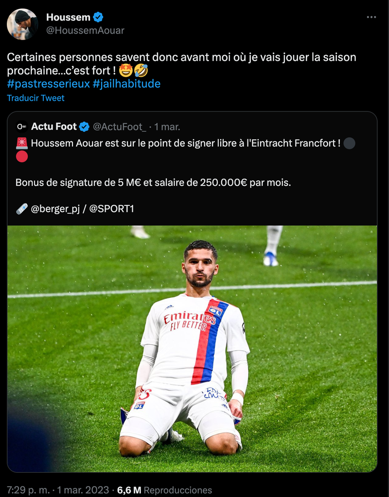 El futuro de Houssem Aouar, como unas de las 'gangas' del próximo mercado estival que es, continúa en el aire. Nadie se atreve a estas alturas a apostar por la camiseta que defenderá el franco-argelino, que desmentía recientemente la publicación de medios galos y alemanes acerca de su compromiso ya rubricado con el Eintracht, dando a entender que sigue libre. El Real Betis, que tocó todas las puertas habidas y por haber, no pudo sacarlo a bajo coste del Lyon el verano pasado, tras varias reuniones del entonces director deportivo verdiblanco con sus homólogos del OL, quienes comenzaron pidiendo 20 millones de euros para acabar rebajando sus pretensiones si William Carvalho, que no quería y terminó renovando aquí hasta 2026, entraba en el trato. La cosa quedó aparcada un año, con un presunto precontrato que podía romperse por una cantidad módica antes de febrero de 2023 y que ya le ataba a los heliopolitanos a partir de la próxima campaña, aunque el experto en el mercado Matteo Moretto insiste en que no ha rubricado ningún contrato.